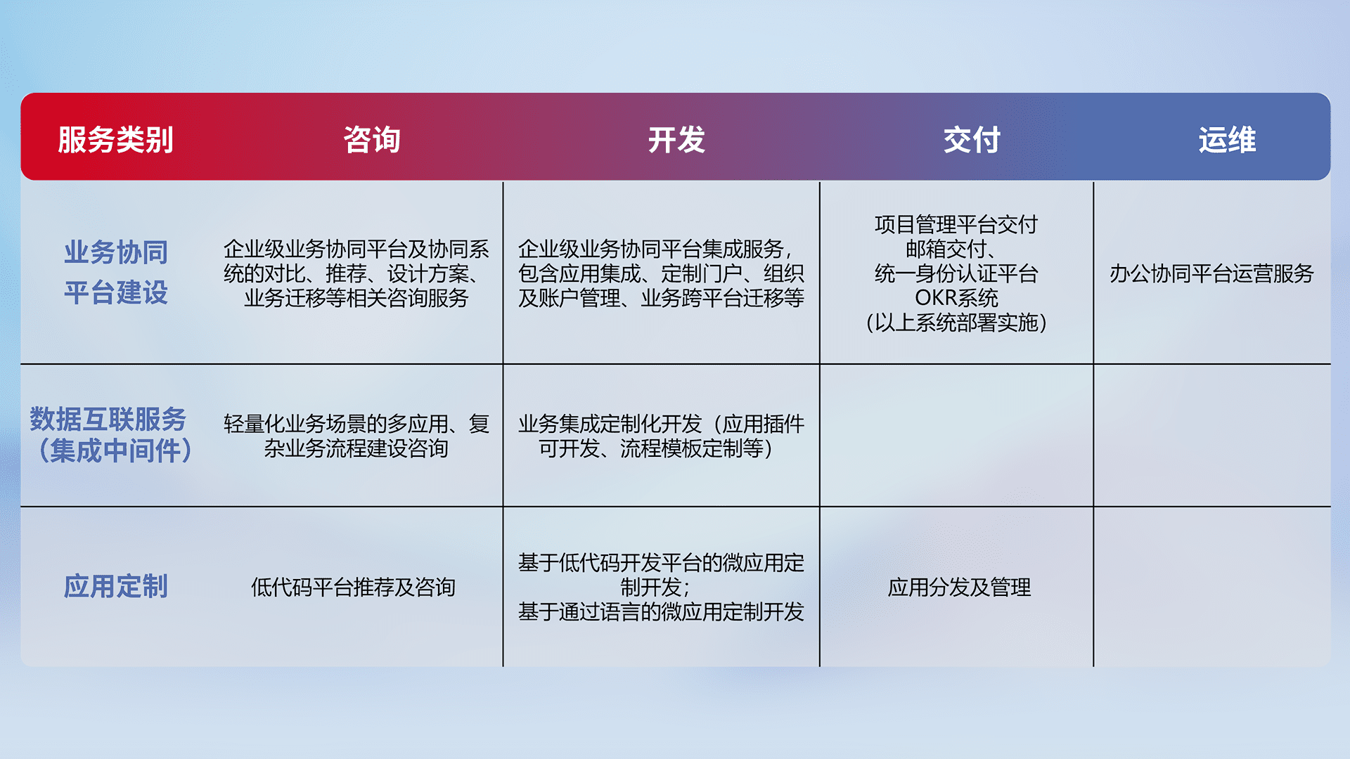 针对钉钉、、、企微、、、IDaas等平台级产品提供产品的规划、、、方案、、、交付、、定制化开发等服务,,,,实现如统一协同办公、、、、智能客户服务、、、、混合会议管理、、智能数据查询、、等业务场景,,,,实现数字化转型。。。