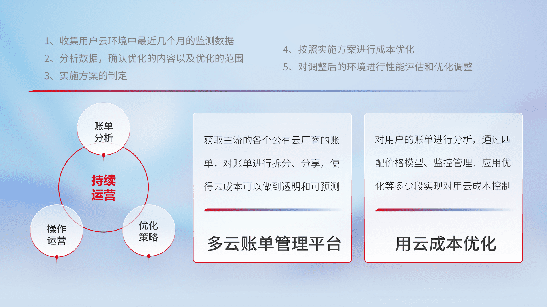 通过多云纳管,,,以统一的资源数据模型把客户的云资源进行抽象和封装,,,进而实现对多云资源的统一操作,,保障云资源管理的可靠性、、、稳定性与可用性。。量身定制化运维内容,,,配置、、、开发运维、、、、补丁管理、、、、备份、、监控、、、认证和访问管理、、审计和日常巡检等,,保障在用云过程中的可靠度,,稳定度以及高可用率。。。